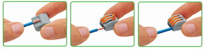 通用导线连接器(222系列)与用于接线盒的插线式连接器(773)一样具有一个测试位和较高的防漏电能力,并且能做更多的事情和适用更多的导线类型。在无工具的条件下,可连接0.08mm2到4mm2的细多股导线及小于等于2.5mm2的硬导线,最大持续运行温度为85℃。